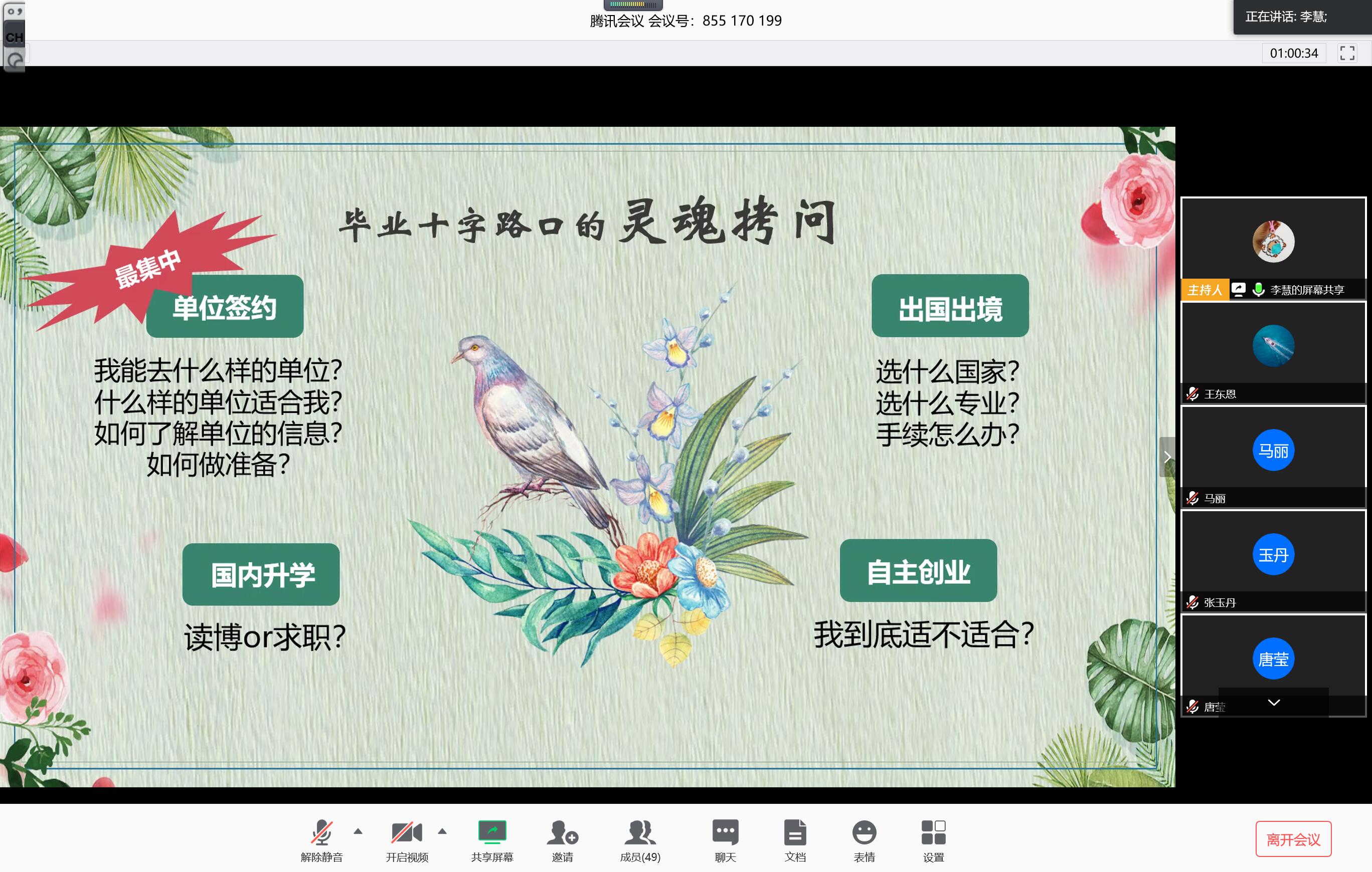 本次就业指导报告会虽然采取线上形式进行,然而同学们依然情绪高涨,收获满满,通过李老师精彩的讲述,同学们不仅对自身求职能力有了更加清晰的认识,也增强了求职信心。(文/贺晓琴;图/王东恩;审核/赵媛媛)
