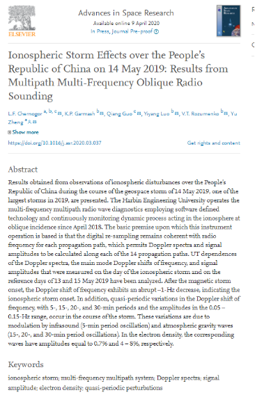 近日,电子信息(微纳技术)学院郑宇博士在地球科学领域重要学术期刊《Advances in Space Research》上发表题为“Ionospheric Storm Effects over the People's Republic of China on 14 May 2019: Results from Multipath Multi-Frequency Oblique Radio Sounding”的研究论文。