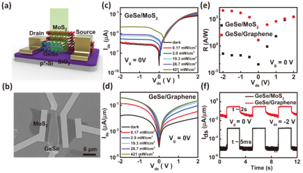 基于此,杨振宇团队使用p型半导体GeSe和n型半导体MoS2,构建了基于GeSe/MoS2异质结的光伏型光探测器;同时,由于Graphene的费米能级和GeSe的费米能级十分接近,使用Graphene作为接触电极,构建了GeSe/Graphene异质结的光电导型光探测器,系统地解释了它们在光探测方面的差异。在光探测性能方面,在击穿电压以内,施加反向偏压时,无论反向偏压如何变化,GeSe/MoS2的光伏型光探测器的光电流等光探测性能基本保持不变,只与光照强度有关,并且其具有较快的光响应速度。与GeSe/MoS2的光伏型光探测器相比,GeSe/Graphene的光电导型光探测器的光电流等光响应特性不仅随着光照强度发生变化,也会随着反向偏压的增加而增强。造成这种现象的主要原因是:光伏型光探测器在反向偏压下导电模式是耗尽区中的少数载流子导电,控制光电流的主要因素是少数载流子的数目,这只与光照强度正相关,而与反向偏压的大小无关。而光电导型探测器因其传导模式是无障碍区域中的多数载流子传输,施加反向偏压的大小与影响其载流子传输速度,从而影响光电流的大小。
