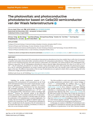 近日,电子信息(微纳技术)学院青年教师杨振宇博士在Nature Index著名学术期刊《Applied Physics Letters》上发表了题为“The photovoltaic and photoconductive photodetector based on GeSe/2D semiconductor van der Waals heterostructure”的研究论文。该论文被编辑选为“Editor's Pick”文章,在APL官网首页加以重点展示。(Editor's Picks serve to highlight articles with excellent scientific quality and are representative of the work taking place in a specific field)。