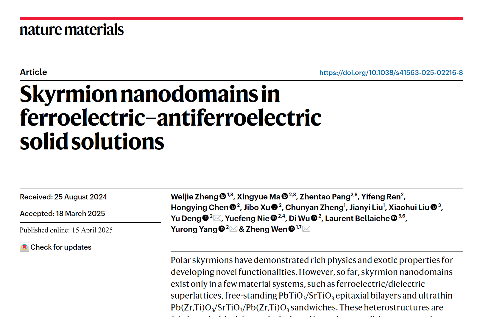 Beat365官网温峥课题组与南京大学现代工程与应用科学学院杨玉荣课题组、邓昱课题组合作,在铁电畴结构和新一代信息技术上取得突破,相关研究成果以“Skyrmion nanodomains in ferroelectric–antiferroelectric solid solutions”为题于4月15日在线发表在Nature Materials期刊。