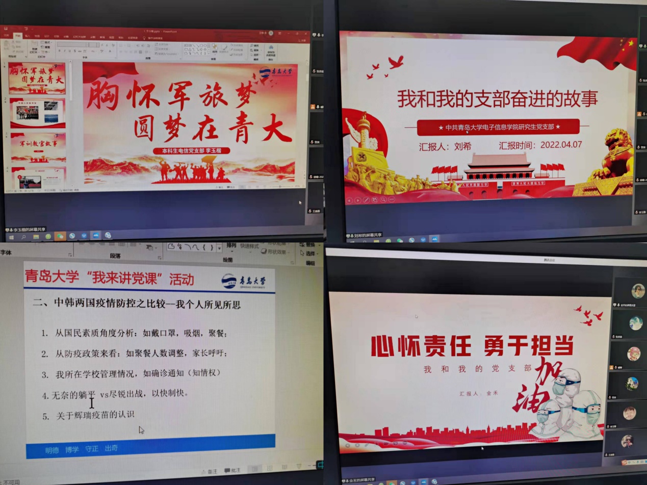 “我来讲党课”比赛环节,教师党员贺英以“铭记党史,不忘初心”为题,讲述了自身学习党史、新中国史、改革开放史、社会主义发展史的体会;教师党员于腾以“牢记英雄事迹 传承伟大精神”为题,讲述了新时代要继承和弘扬伟大抗美援朝精神,为实现中华民族伟大复兴而奋斗;教师党员孙中森以“国家的需要就是我们的责任---学习优秀共产党员蒋筑英事迹”为题,讲述了一名优秀知识分子献身祖国科学事业的感人事迹和历史担当。学生党员徐晴以“抗击疫情,我们在行动”为题,讲述了今年3月青岛疫情防控中学校为确保师生身心健康和有序学习生活,采取的一系列保障措施;学生党员王哲以“抗新冠疫情,献礼二十大”为题,讲述了学生党员积极参与疫情志愿服务,发挥党员先锋模范作用;学生党员石孜淳以“疫情大考,做好人生答卷”为题,讲述了新冠疫情防控中青年大学生的从容自信、勇担重任、积极奉献的精神风貌;学生党员崔海媛以“一寸山河一寸血,一抔热土一抔魂”为题,讲述了赵一曼和郭亮信仰的故事,激励后人“踔厉奋发、笃行不怠”“一起向未来”;学生党员彭丽艳以“百年接力,与光同行”为题,讲述了我校附属医院内分泌科创始人90岁老党员牛祺衡的成长、担当和奉献;学生党员王庞青以“让青春绽放绚丽光彩”为题,讲述了优秀共产党员、科学家顾方舟在小儿麻痹症疫苗研发中的感人故事;学生党员杜梦圆以“信仰的力量 铁心跟党走”为题,讲述了承载着历史记忆与长征精神的半截牛皮腰带的故事,展现了共产党人坚韧不拔的信仰意志。