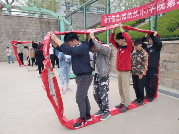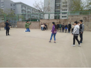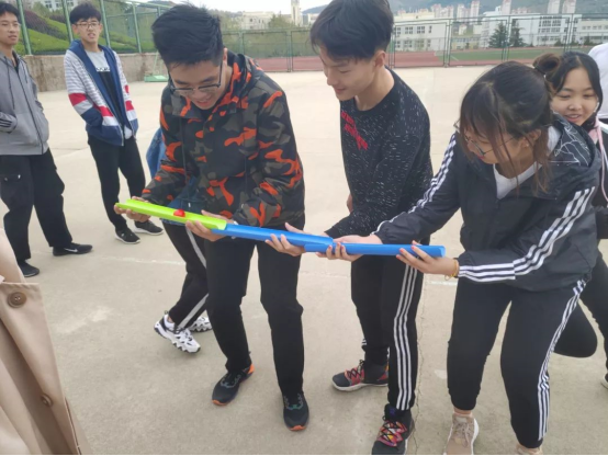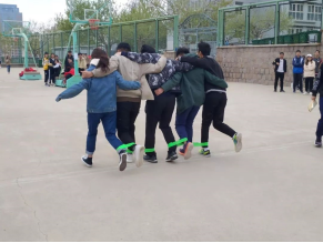 经过了一个中午的休整,同学们又开始了下午的比赛。第一项是传呼啦圈和“仙人指路”,参赛的同学们手拉着手传递呼啦圈,传递后紧接着一名同学转十圈蒙眼背着另一名同学,被背的同学发出指令指挥另一名同学按照规定路线走到终点。由于看不见路线,参赛的同学们走出的路线千奇百怪,也给大家带来不少欢乐。