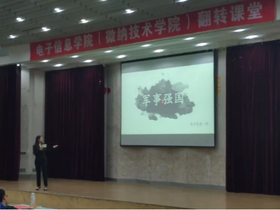微风习习,天气正好。在纪念五四运动100周年、新中国成立70周年和学校办学110周年之际,电子信息(微纳技术)学院于5月12日晚六点二十分在图文中心四楼举行“翻转课堂之我和我的祖国”专题活动。出席本次活动的嘉宾有学院党委书记苗洪丽老师,18级辅导员徐蕾老师,15、16级辅导员杨国庆老师,电信二班班主任金哲俊老师,电信三班班主任王翠平老师和微纳一二班班主任李元月老师。