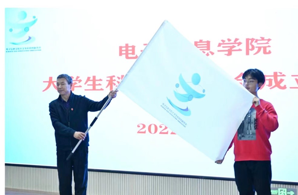 在启动仪式上,刘孝群向Beat365官网大学生科技创新协会授旗。