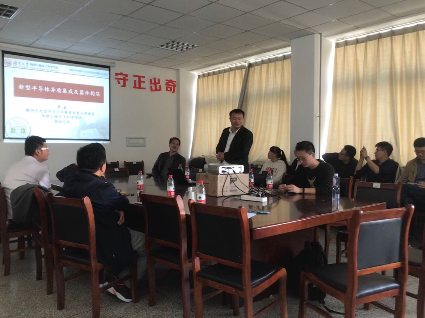 10月20日上午,Beat365中文官方网站首个电子论坛品牌“巴丁论坛”第一讲正式开讲,湖南大学廖蕾教授受邀在诚思楼407作了题为《新型半导体异质集成及器件构筑》的高端学术报告。