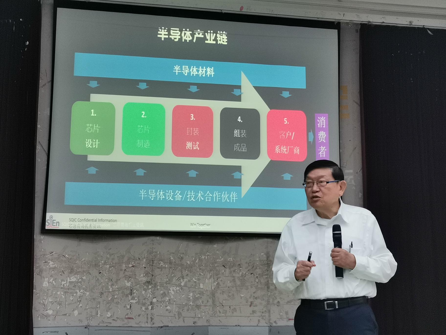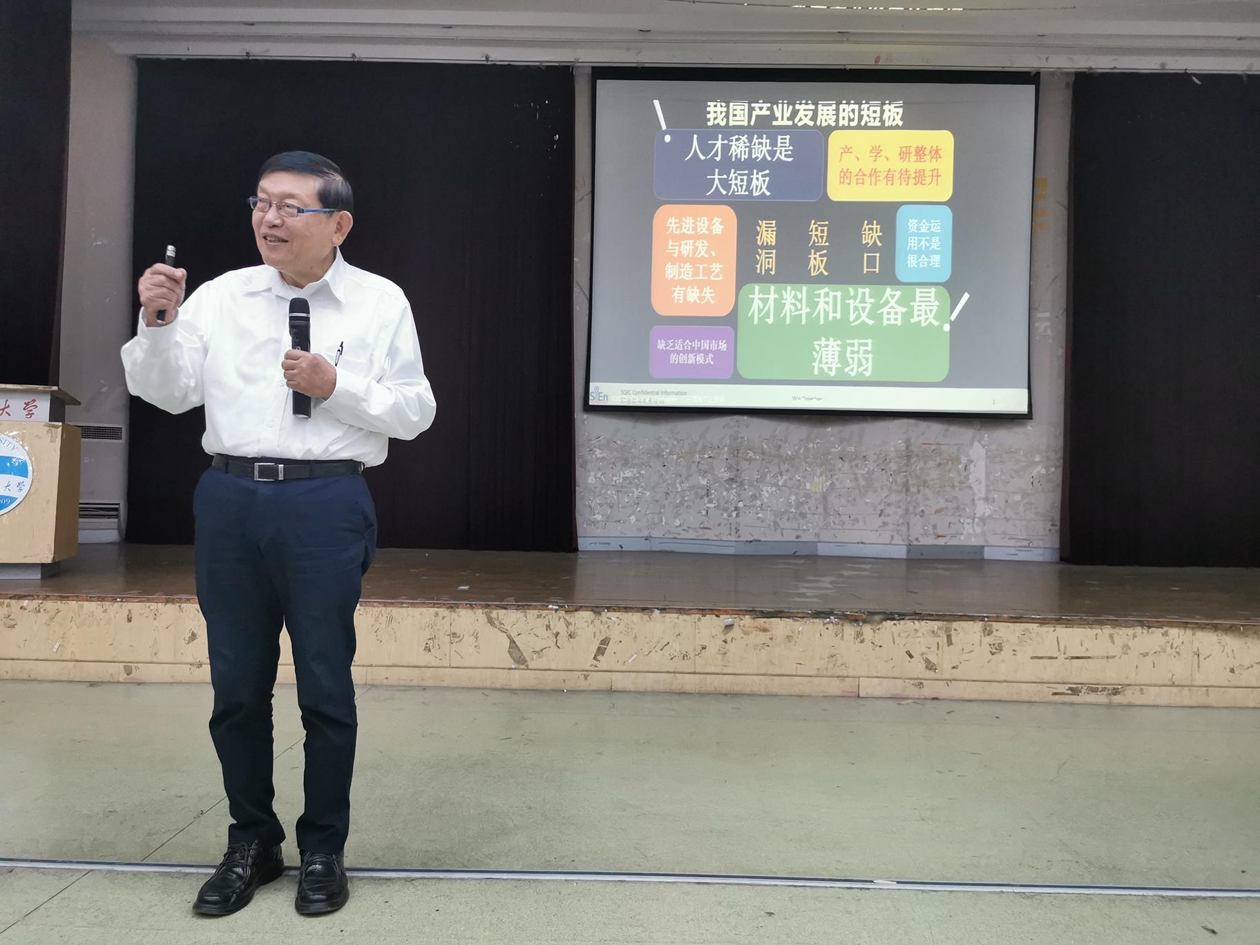 首先,张汝京博士向同学们介绍了半导体行业的基本情况。他指出我国当前在芯片制造业存在短板,尤其在材料和先进设备研发,人才培养两方面最为突出。张汝京博士援引近期中兴事件,强调只有掌握最核心技术,才能避免被别人遏制住发展。同时,张汝京博士针对国内目前技术短缺的实情,提出同学们要有敢为人先的精神,张汝京博士说:“别人都不去攻克的难题,那就我们去攻克它!”