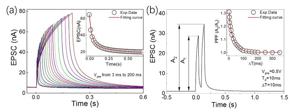 利用单个电子器件模拟神经形态功能是当前研究领域的一大热点。传统计算系统受限于冯诺依曼瓶颈的制约,在高速传输且大规模处理复杂信号时具有明显的劣势。人脑是一个具有1000亿个神经元和1000万亿个神经突触高度互联,且大规模并行的复杂网络,这种结构使得它具有比传统计算机具有更强健、更可塑、更容错的记忆和学习功能。单福凯教授课题组将离子积累/弛豫过程和经典场效应晶体管特性相结合,成功制备了基于离子-电子耦合的金属氧化物纳米线突触晶体管。该器件成功模拟了双脉冲易化、高通滤波、脉冲时间依赖突触可塑性等生物突触行为。器件具有极低的功耗,单个突触事件的能量消耗只有0.44 pJ,低于绝大部分三端突触器件。这项成果为制备纳米线突触器件提供了新的思路。