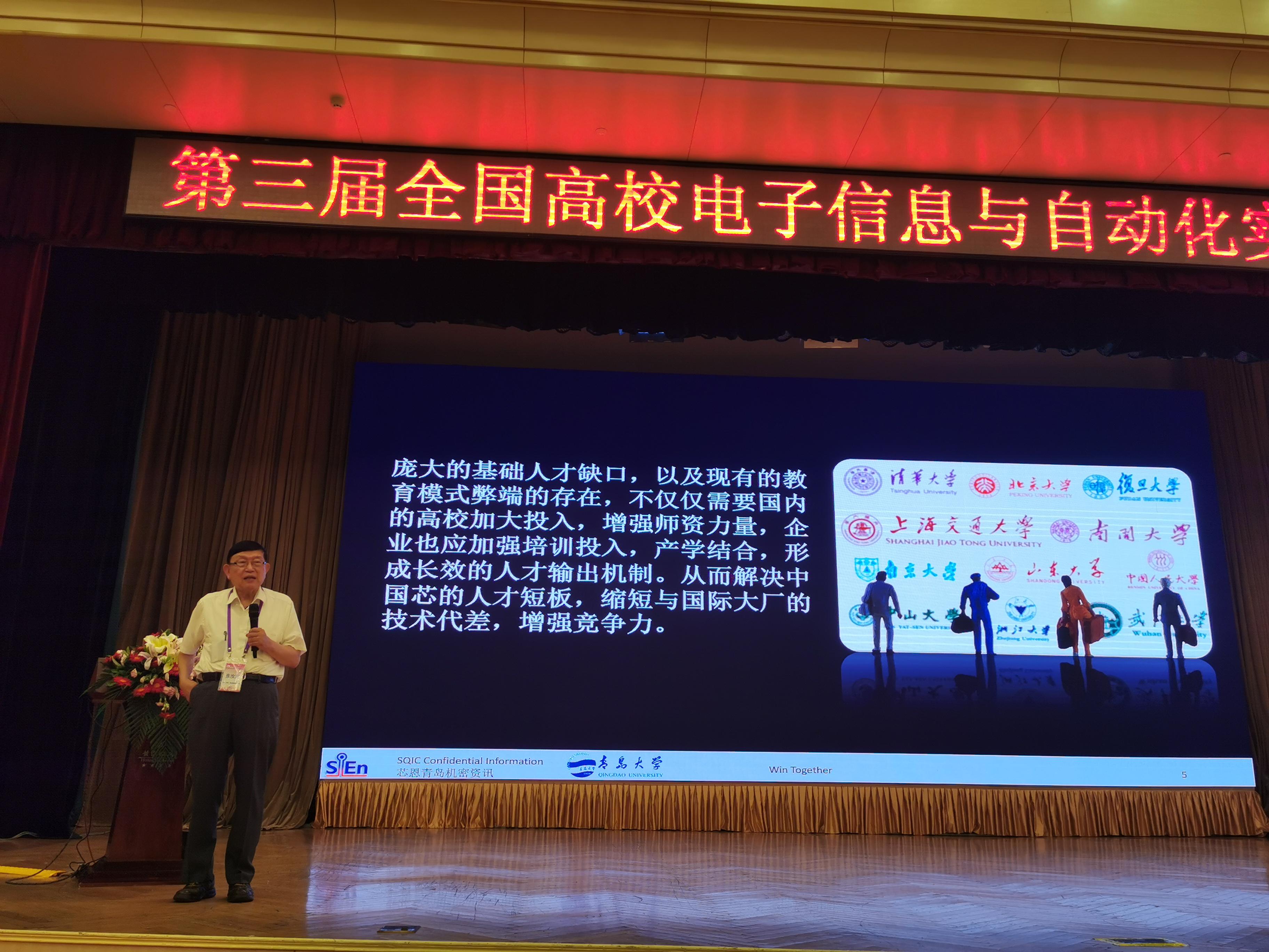 7月15日下午,芯恩(青岛)集成电路有限公司董事长、Beat365中文官方网站微纳技术学院终身名誉院长、讲席教授张汝京在青岛黄海饭店举办的“第三届全国高校电子信息与自动化实践教学论坛”上做了题为《集成电路人才培养》的精彩报告。