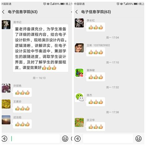 学院领导和老师们纷纷表示董介春老师的线上实验课让自己受益匪浅。党委书记苗洪丽评价到:“董老师备课充分,为同学生准备了详细的课堂内容,结合电子设计软件,现场演示设计内容。逻辑清晰,讲解详实,在电子设计实验中节奏适中,兼顾同学们的跟随进度,调取同学们的设计界面,及时了解同学们的掌握程度,课堂效果好。”