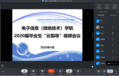 4月29日上午,电子信息(微纳技术)学院使用“钉钉”软件平台召开了2020届毕业生“云指导”考研就业视频工作会,党委书记苗洪丽、党委副书记李政、院长助理宿杰、通信工程系主任李长红、电子工程系主任迟洁茹、微纳电子学系负责人郑宇及毕业生辅导员、毕业生班主任和全体2020届毕业生参加了会议,会议由正科级辅导员杨国庆主持。