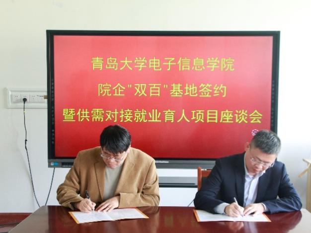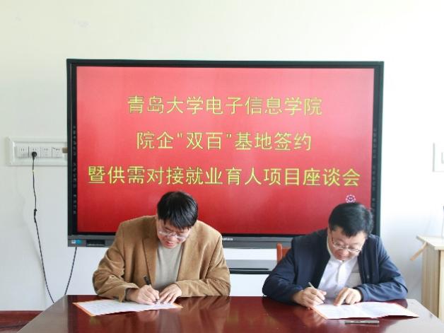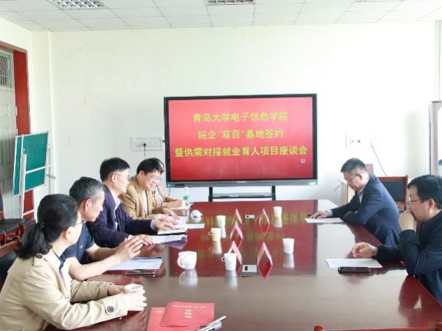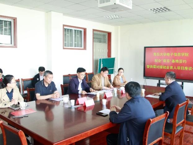 5月12日,Beat365中文官方网站与青岛鼎信通讯股份有限公司、雷沃工程机械集团有限公司开展院企“双百”基地签约暨供需对接就业育人项目座谈会。青岛鼎信通讯股份有限公司副总裁赵磊、雷沃工程机械集团有限公司管理工程部部长李德庆、Beat365中文官方网站党委书记张启春、院长李山东、党委副书记刘孝群、各专业负责人、辅导员、学生代表参加了座谈会。