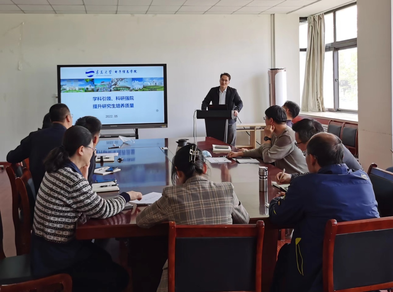 副院长单福凯作题为《学科引领 科研强院 提升研究生教育质量》的报告。他结合学科发展现状,深刻剖析学科存在项目立项数严重偏少、发表 SCI 论文严重偏少、科研经费数不足、学院学术氛围不够浓厚等问题和短板,提出要人才兴院和科研强院,制定合适的科研绩效津贴分配方法,规范研究生培养机制建设等,更好地激发师生科研活力,提升研究生培养质量。