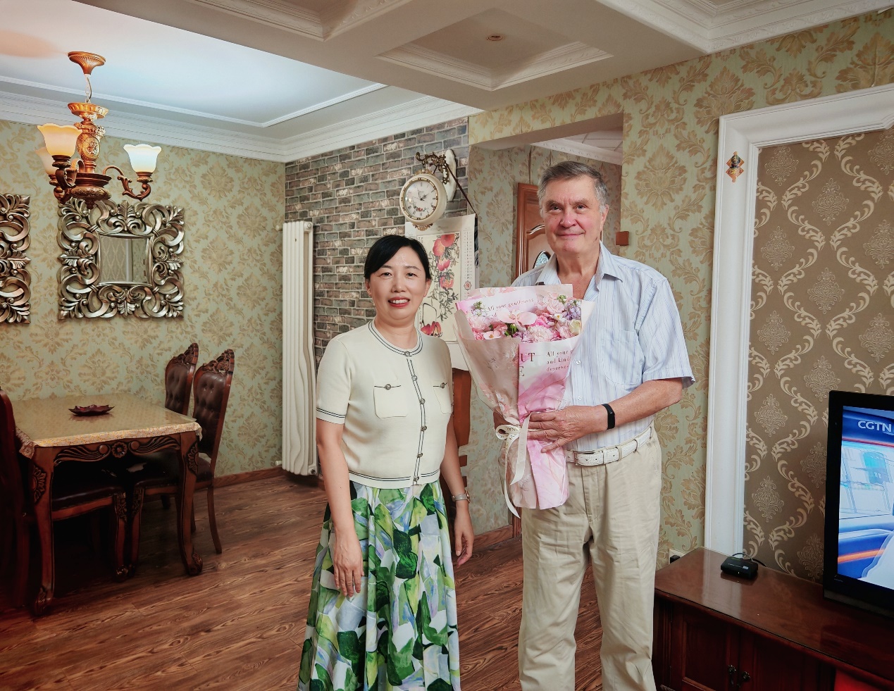 慰问现场氛围温馨融洽。孙丽娜书记向莱昂尼德·切尔诺高尔院士献上鲜花,关切询问他近期的工作进展与生活情况。她表示,莱昂尼德·切尔诺高尔院士作为国际知名专家,不仅为学院带来了前沿的科研理念与技术方法,还在学科建设、团队建设等方面倾囊相授,助力学院培养了一批具备国际视野的专业人才,其严谨的治学态度与敬业精神深受师生敬佩。