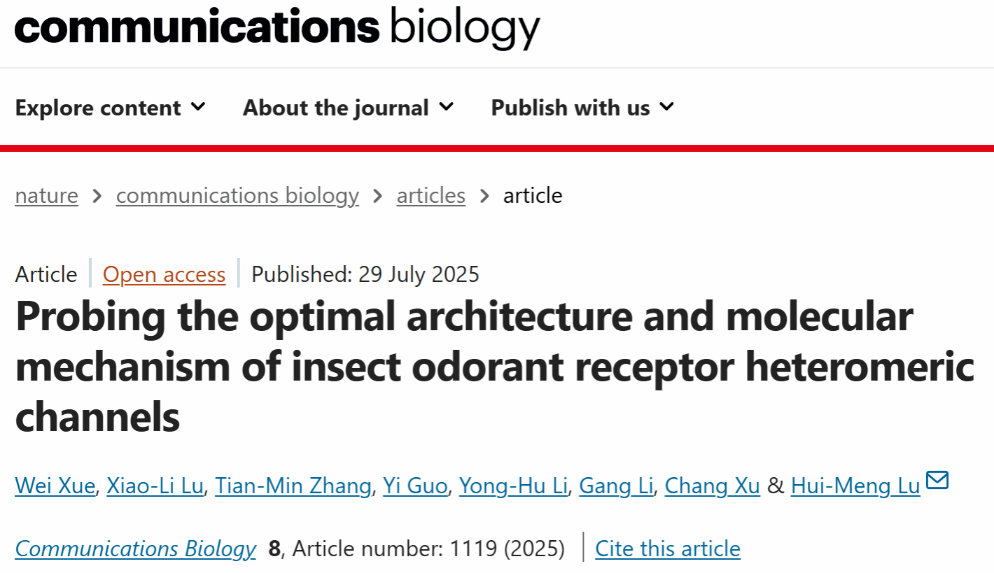 日前,欧博ABG中文官网入口卢慧甍副教授课题组在Nature旗下期刊《Communications Biology》(中科院一区TOP)发表论文“Probing the optimal architecture and molecular mechanism of insect odorant receptor heteromeric channels”。