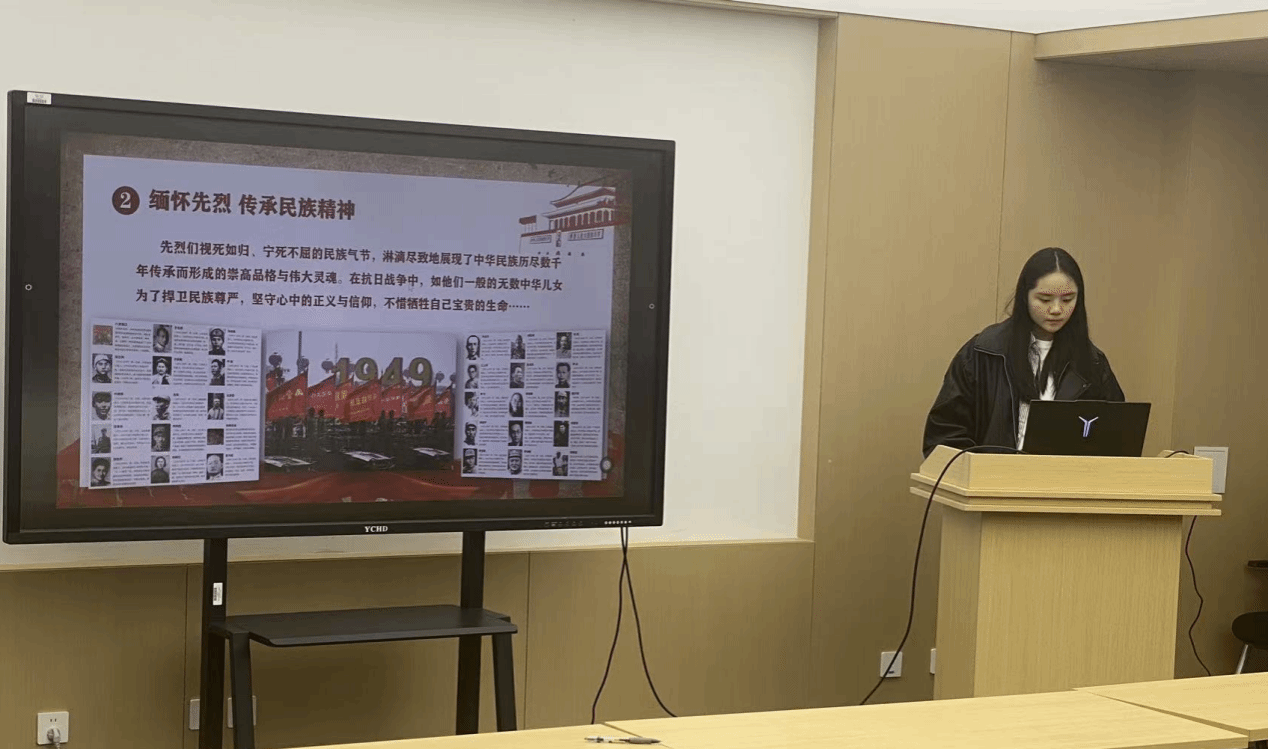 在追忆中凝聚力量,在传承中锚定方向。活动开始,2025级研究生杭天煜同学带领大家回顾抗日战争中的里程碑事件,并强调铭记历史不是为了延续仇恨,而是为了汲取奋进力量。随后,杭天煜同学缅怀了狼牙山五壮士、杨靖宇等革命烈士的英雄事迹,以伟大抗战精神为内核,缅怀先烈、传承他们视死如归、宁死不屈的民族气节和伟大抗战精神。进一步地,她以沙特伊朗历史性和解为引,剖析务实战略思想,强调危机意识,阐释“珍爱和平、维护世界稳定”的重要精神内核。最后,她结合我国在关键领域破解“卡脖子”困境的发展历程,呼吁广大青年以史为鉴,坚定理想信念,培养创新精神,勇于担当作为,为实现中华民族伟大复兴的中国梦贡献力量。