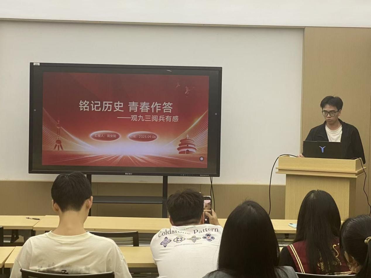 铭记历史,珍爱和平,奋发进取,强国有我。进一步地,2025级研究生周安阳同学以九三阅兵为切入点,首先带领同学们回顾了仪式现场的盛况。从徒步方队步伐整齐划一、装备方队新型装备震撼亮相,到空中梯队的精彩表演和抗战老兵的动人致敬,全方位展现了中国军队的强大实力与历史传承。随后,他深入分析了阅兵所体现的国家综合实力、军队现代化进程以及和平使命担当,对比了2009、2015年阅兵,突出了2025年阅兵在规模和装备上的巨大进步,并对智能化战争趋势下中国军队面临的挑战进行了展望。此外,他分享了他前往“第一面军旗升起的地方”—江西九江修水学习的实践经历,呼吁同学们重温来时路,深化国防认知,勇担新使命。