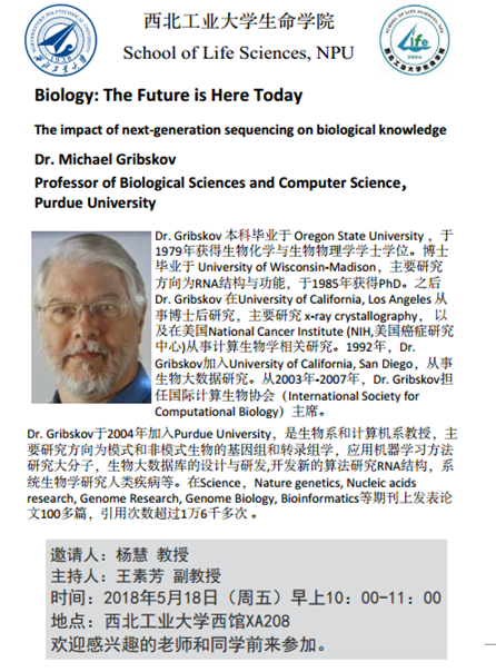 报告人简介:Dr. Gribskov本科毕业于Oregon State University,于1979年获得生物化学与生物物理学学士学位。博士毕业于University of Wisconsin-Madison,主要研究方向为RNA结构与功能,于1985年获得PhD。之后Dr. Gribskov在University of California, Los Angeles从事博士后研究,主要研究x-ray crystallography,以及在美国National Cancer Institute (NIH,美国癌症研究中心)从事计算生物学相关研究。1992年,Dr. Gribskov加入University of California, San Diego,从事生物大数据研究。从2003年-2007年,Dr. Gribskov担任国际计算生物学(International Society for Computational Biology)主席,从2004年开始,他加入Purdue University,是生物系和计算机系教授,主要研究方向为模式和非模式生物的基因组和转录组学,应用机器学习方法研究大分子,生物大数据库的设计与研发,开发新的算法研究RNA结构,系统生物学研究人类疾病等。在Science,Nature genetics, Nucleic acids research, Genome Research, Genome Biology, Bioinformatics等期刊上发表论文100多篇,引用次数超过1万6千多次。