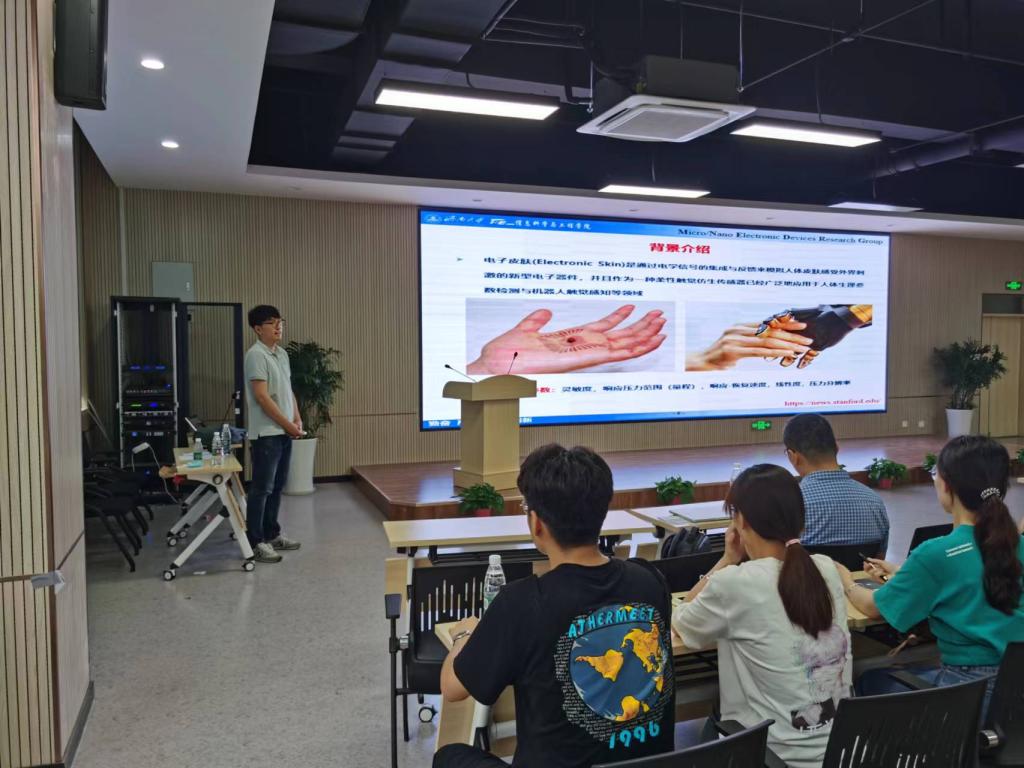 2022年7月6日下午14:00-17:00,在同学们热烈的掌声中, 济南大学信息学院团队带头人李阳教授给电子信息(微纳技术)学院师生带来一场题为《柔性智能电子感知皮肤》的高端学术报告。