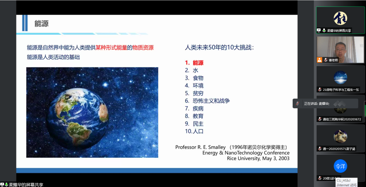2022年7月8日上午8:30-12:30,暨南大学麦耀华教授在腾讯会议上做了题为《高效率钙钛矿太阳电池与组件》的学术报告,Beat365中文官方网站的部分本科生、研究生以及教师参加了本次活动。麦耀华教授从能源角度入手,阐述了全球能源形势,碳达峰和碳中和等当前热点话题,引出太阳能的优势、发展历史及研究现状,最后介绍了钙钛矿太阳电池的相关技术及应用前景。麦教授的讲座图文并茂,深入浅出,将深奥的太阳能技术讲的浅显易懂,参会师生纷纷表示讲座精彩生动,受益匪浅,对中国光伏产业发展的未来有了更多的了解和期待。